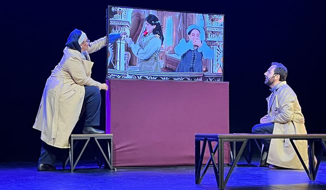 Así surgió Falsa conferencia de “La firmeza en el ausencia”: una mezcla de conferencia y teatro donde los personajes, sor Marcela de san Félix y el académico Felipe Vistahermosa (interpretados por Paola Izquierdo y Fernando Villa), tratan de explicar la obra, pero terminan actuándola porque el “video de apoyo” está incompleto.