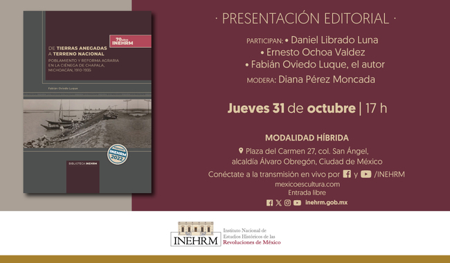 El Instituto Nacional de Estudios Históricos de las Revoluciones de México (INEHRM), dependencia de la Secretaría de Cultura del Gobierno de México, invita a la presentación del libro: De tierras anegadas a terreno nacional. Poblamiento y reforma agraria en la Ciénega de Chapala, Michoacán, 1910-1935, del historiador Fabián Oviedo Luque, del Instituto de Investigaciones Históricas de la Universidad Michoacana de San Nicolás de Hidalgo.