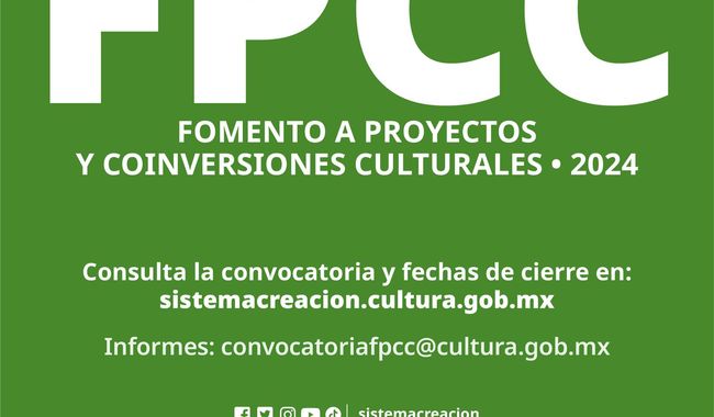 La Secretaría de Cultura del Gobierno de México, a través del Sistema Creación, publica la convocatoria de la vertiente Fomento a Proyectos y Coinversiones Culturales 2024, que ofrece apoyos económicos hasta por $750,000.00 (setecientos cincuenta mil pesos 00/100 M.N.) en coinversión para el desarrollo de proyectos artísticos y culturales en un plazo máximo de 12 meses.