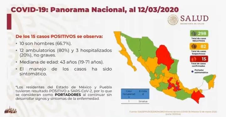 Fue en una conferencia que dio a conocer, que ninguno de los pacientes muestra síntomas graves, por lo que, no hay que alarmarse. Además, indicó que el «caso recuperado» se encuentra en Sinaloa, un hombre que acaba de cumplir 14 días de aislamiento.